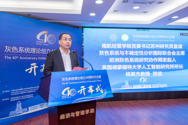 经济与管理学院党委书记苏州宣读了灰色系统与不确定性分析国际联合会执行主席、英国德蒙福特大学人工智能研究所所长杨英杰教授的贺信。贺信从学术组织、学术期刊和学术会议三个维度对灰色系统理论的国际学术话语权进行了阐述,对与南航共同促成中国与欧盟、英国间的国际合作表示高度肯定。