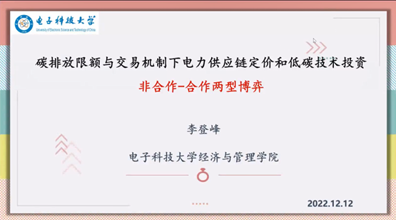 12月12日下午,长江学者特聘教授、电子科技大学经济与管理学院李登峰教授受学院智能决策与风险分析研究所邀请,在腾讯会议作题为“碳排放限额与交易机制下电力供应链定价和低碳技术投资非合作-合作两型博弈”的学术讲座。我院教授徐海燕、副教授高广鑫等教师及部分硕、博研究生线上参加了李教授的报告分享,本次学术报告由徐海燕主持。