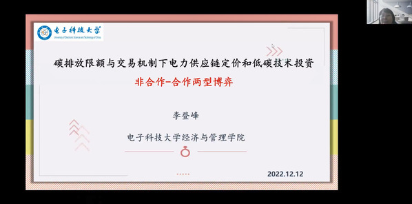 12月12日下午,长江学者特聘教授、电子科技大学经济与管理学院李登峰教授受学院智能决策与风险分析研究所邀请,在腾讯会议作题为“碳排放限额与交易机制下电力供应链定价和低碳技术投资非合作-合作两型博弈”的学术讲座。我院教授徐海燕、副教授高广鑫等教师及部分硕、博研究生线上参加了李登峰的报告分享,本次学术报告由徐海燕主持。