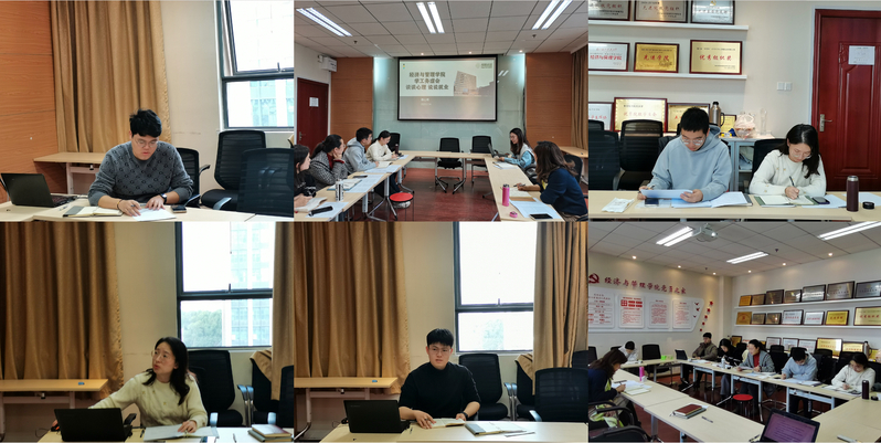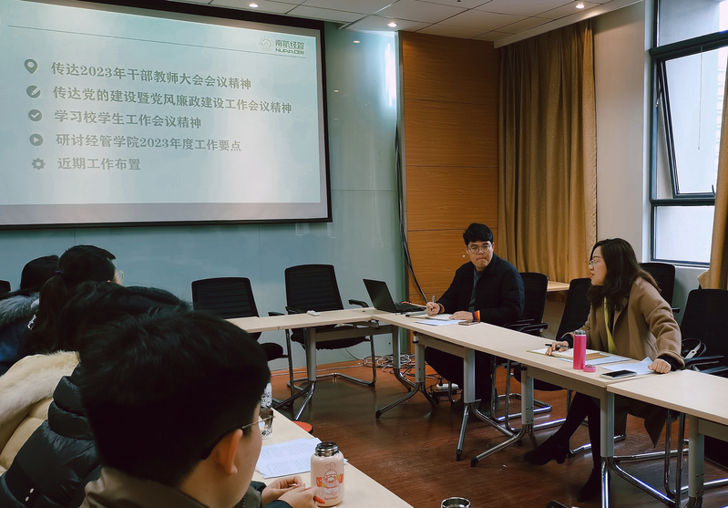 胡苹首先对三次会议精神进行了领学。她指出,学校干部教师大会、党的建设暨党风廉政建设工作会和校学生工作会为我们指明了2023年工作的方向,一要提高政治站位,从学校工作大局出发,结合经管学院实际,有的放矢、创造性地谋划工作,增强工作的系统性。二要聚焦工作重点难点,坚持问题导向,花大力气解决好学风问题和就业问题,将思想引领与解决学生突出问题紧密结合,增强工作的有效性。三要坚持创新驱动发展,探索本研贯通、一体推动的思政模式,持续打造思政工作品牌,增强工作的协同性。四要不折不扣抓落实,坚持“理论学习、深入学生、研用一体”,必须结合学院实际落实落细,拿出真招实招,增强工作的针对性。最后,她强调,“牢记育人之责、落实育人之任、抓好育人之能”,必须时刻牢记育人初心使命,必须带着思考、感情和责任工作,为培养一流的经济与管理类人才做出更大的贡献。