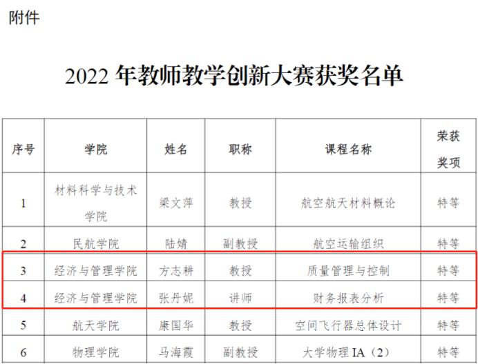 日前,南京航空航天大学公布了“2022年教师教学创新大赛”评选结果,经个人申报、院级选拔、校级初赛和决赛,共有27位教师获奖,其中, 6位教师获特等奖, 10位教师获一等奖, 11位教师获二等奖。我院方志耕教授的《质量管理与控制》、张丹妮讲师的《财务报表分析》获得特等奖。