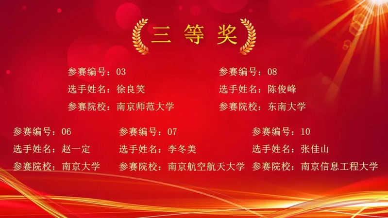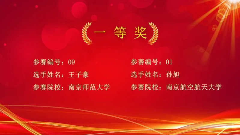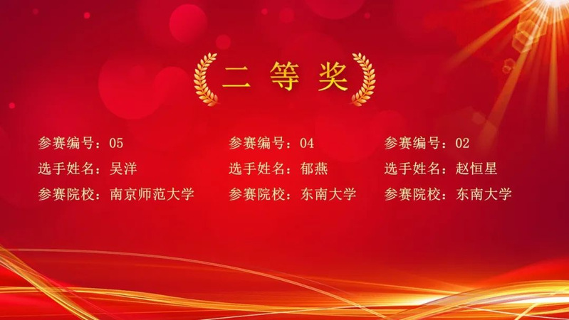 最后,在大家的共同见证下,颁奖盛典正式公布个人荣誉奖项和团队荣誉奖项获奖名单。南京师范大学王子豪、南京航空航天大学孙旭荣获一等奖;南京师范大学吴洋、东南大学郁燕、赵恒星荣获二等奖;南京师范大学徐良笑、东南大学陈俊峰、南京大学赵一定、南京航空航天大学李冬美、南京信息工程大学张佳山荣获三等奖。南京师范大学获得团队一等奖,东南大学获得团队二等奖,南京航空航天大学获得团队三等奖。
