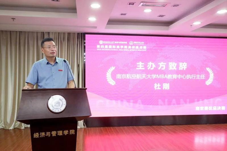 南京航空航天大学MBA教育中心执行主任杜刚代表主办方致辞。杜刚主任表示:国际商学院演讲挑战赛秉承“绽放魅力,连接彼此”的核心理念,体现了现代商业领袖勇于展现个人魅力的精神。赛事搭建了一个商学院优秀学子沟通交流的平台,他们在这里将分享个人奋斗与追求梦想路上的艰辛与收获,增进彼此间的互相了解,产生深度合作;同时链接大量优秀企业家、各行业领域杰出人士,创造出较大的经济与社会效益。国演赛肩负着“讲好中国(E)MBA人故事、传播中国(E)MBA人声音”重要使命,影响力覆盖中国100余所商学院/管理学院!