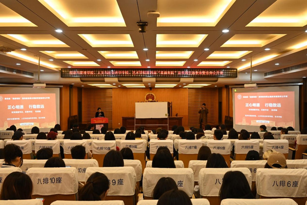 正值“国际反腐败日”、第四届“清廉南航”宣传教育周之际,12月9日,由经济与管理学院、人文与社会科学学院、艺术学院共同承办的“正心明道,行稳致远”廉洁主题信仰公开课在人文与社会科学学院模拟法庭举行。本次公开课由校党委副书记、纪委书记杭育新担任授课嘉宾,经济与管理学院党委书记苏州、人文与社会科学学院党委书记楚广兴、经济与管理学院党委副书记胡苹、人文与社会科学学院党委副书记刘思辰、艺术学院党委副书记王宇宁,三学院辅导员、学生党员、入党积极分子及经管学院本科生第三党支部全体成员等近200名师生共同参加了本次活动。