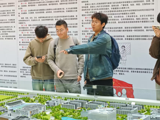 接着同学们共同“俯瞰”了南京航空航天大学天目湖校区。参观活动现场放置了校区微观模型,同学们兴致勃勃地向同伴们分享校区建筑背后所蕴含的“红色基因”与“蓝色梦想”。从“巡天遥看一千河”的巡天楼所体现的为国家航空航天事业发展不懈奋斗的报国热情,到“志在长空牧群星”的牧星楼所彰显的南航学子胸怀天下壮志昂扬的爱国热血,同学们在交流和互动中加深了对校区建设与发展的了解与体悟。