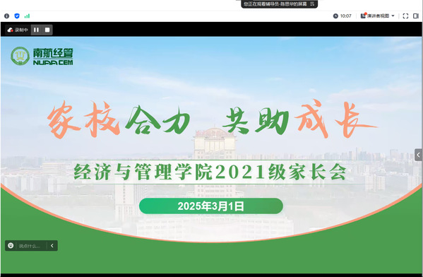 为深化家校协同育人机制,凝聚教育共识,助力2025届毕业生高质量就业,经济与管理学院于3月1日晚召开毕业生家长会。会议以线上的方式举行,学院党委副书记胡苹、辅导员陈思华与一百五十余名家长共话学生成长路径,共谋发展良策。