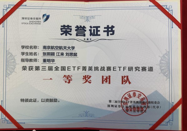 2025年3月19—20日,由深圳证券交易所作为指导单位,东方财富作为主办平台,广发基金、华夏基金、易方达基金、国泰基金、富国基金、华安基金、汇添富基金、平安基金、工银瑞信基金、银华基金、大成基金、东财基金十二家基金公司联合主办的第三届全国ETF菁英挑战赛在深圳交易所上市大厅成功举办,吸引了全国2763所高校近60万人参与。经过初赛与复赛的激烈角逐,来自南京航空航天大学、北京大学、武汉大学等11所高校的学生团队入围研究报告赛道总决赛。我院2022级金融专业三名本科生张熙颖、刘思懿、江来同学在董明华老师和苏飞老师的指导下斩获研究赛道一等奖。