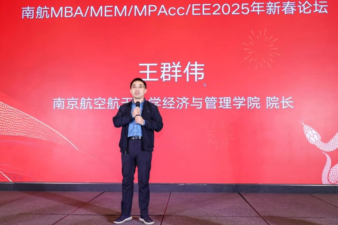 南航经济与管理学院院长王群伟向莅临现场的各位嘉宾表示了最诚挚的欢迎,并致以新春的美好祝福。王群伟院长充分肯定了南航MBA联合会在2024年的工作成果,对全体成员的辛勤付出与努力给予了高度评价。同时着眼于 2025 年,王群伟院长也提出了新的期许,鼓励联合会在未来的工作中继续奋进,取得更加优异的成绩。