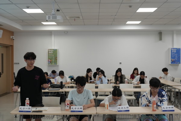 为深化专业教育与思政教育融合,落实立德树人根本任务,筑牢青年思想根基,锤炼学生逻辑思维与公共表达能力,6月12日下午,学院在天目湖校区明慧楼C110教室举办“经英领航”——经济与管理学院2024级本科生辩论赛,在《思想道德与法治》课程中开展一次别开生面的翻转课堂。学院党委副书记、《思想道德与法治》授课教师胡苹出席本次活动,2024级本科生辅导员胡心雨、王江鑫以及金融学专业和大数据管理与应用专业学生共同参与其中,现场气氛热烈,思辨火花迸发。