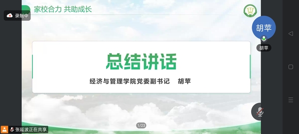 为持续深化家校协同育人机制,凝聚教育共识,助力2026届毕业生顺利升学就业,经济与管理学院于9月13日晚以线上方式召开毕业生家长会。学院党委副书记胡苹、毕业班辅导员张延波与近两百名家长云端相聚,共商学生成长大计,共谋未来发展路径。