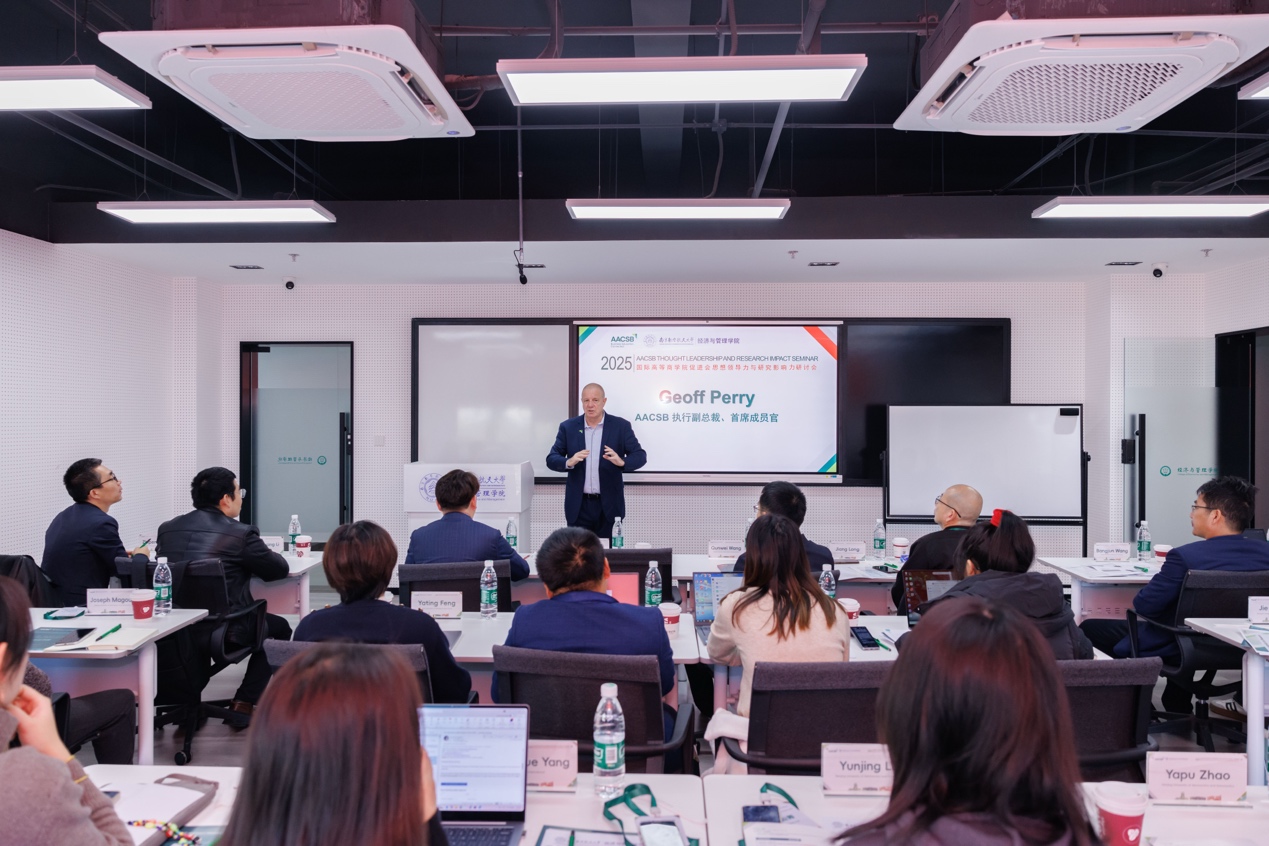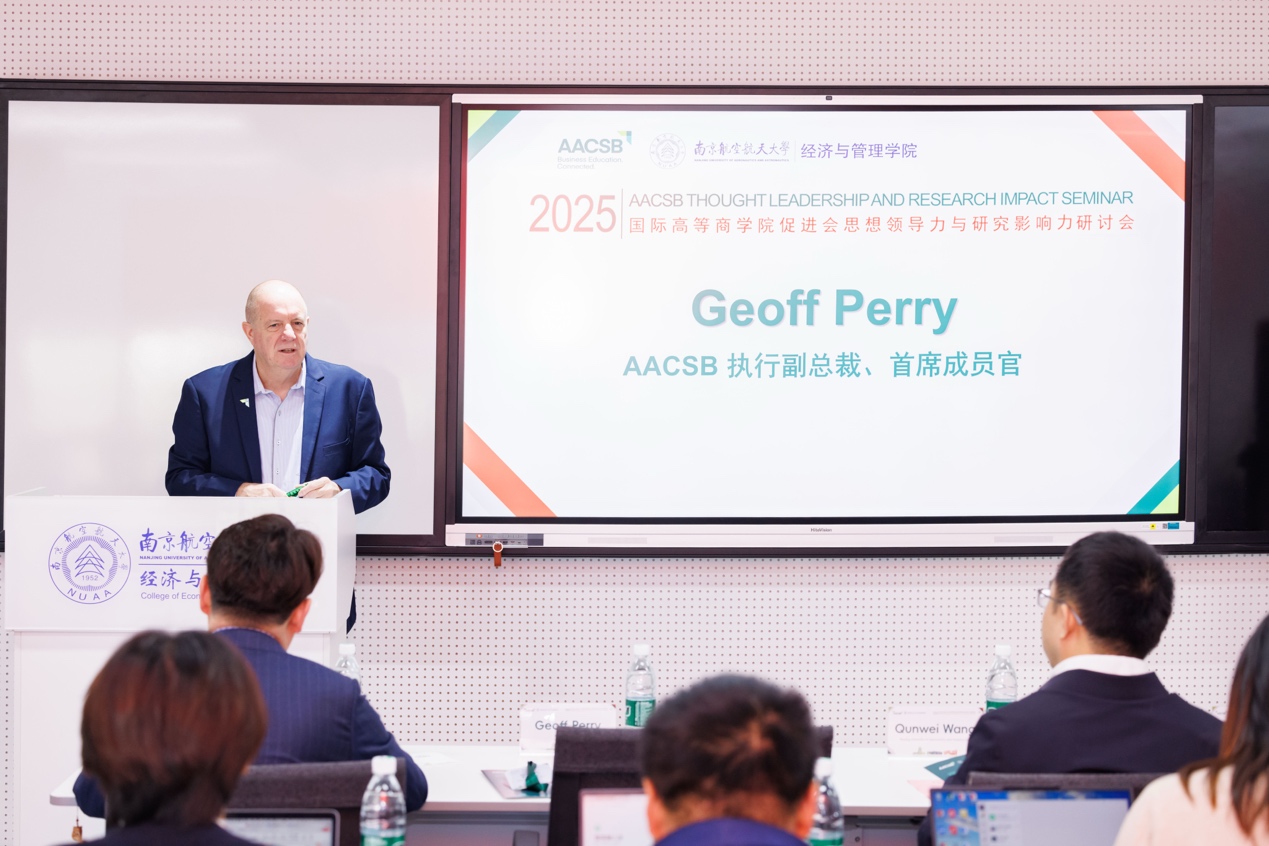 2025年12月3日,由国际高等商学院促进会(以下简称“AACSB”)主办、南京航空航天大学经济与管理学院承办的“思想领导力与研究影响力”标准研讨会成功举办。此次研讨会由AACSB执行副总裁、首席成员官、亚太区及美洲区执行董事Geoff Perry博士担任主讲嘉宾,汇聚了来自国内多所知名高校的院领导、专任教师和行政老师,共同探讨AACSB认证体系中的核心要素——思想领导力与研究影响力。
