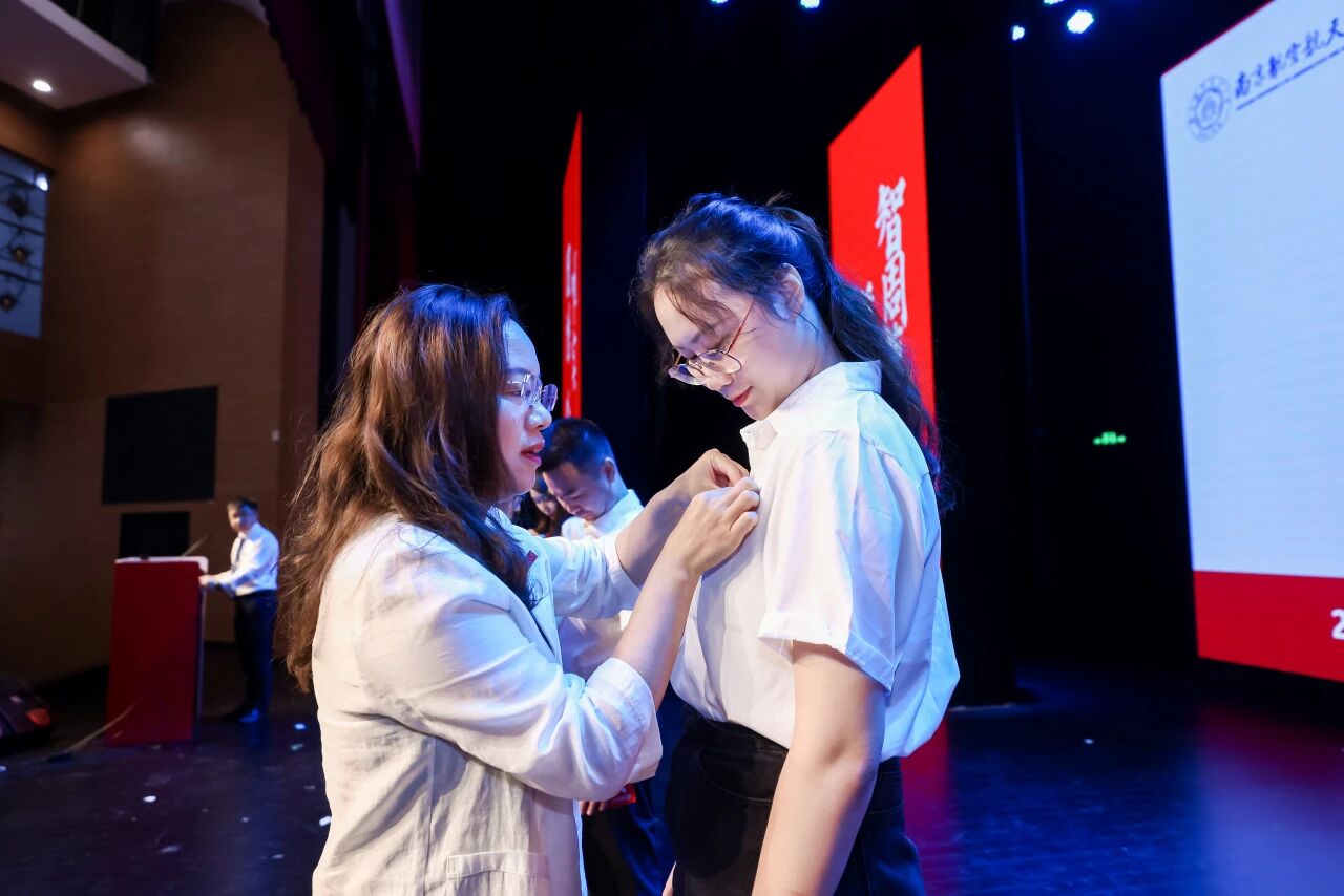 学院副书记胡苹,副院长查冬兰、欧阳林寒为三位新生代表佩戴校徽,全体新生共同宣读入学誓词,一起向学校许下遵循南航校训校风的庄严承诺。