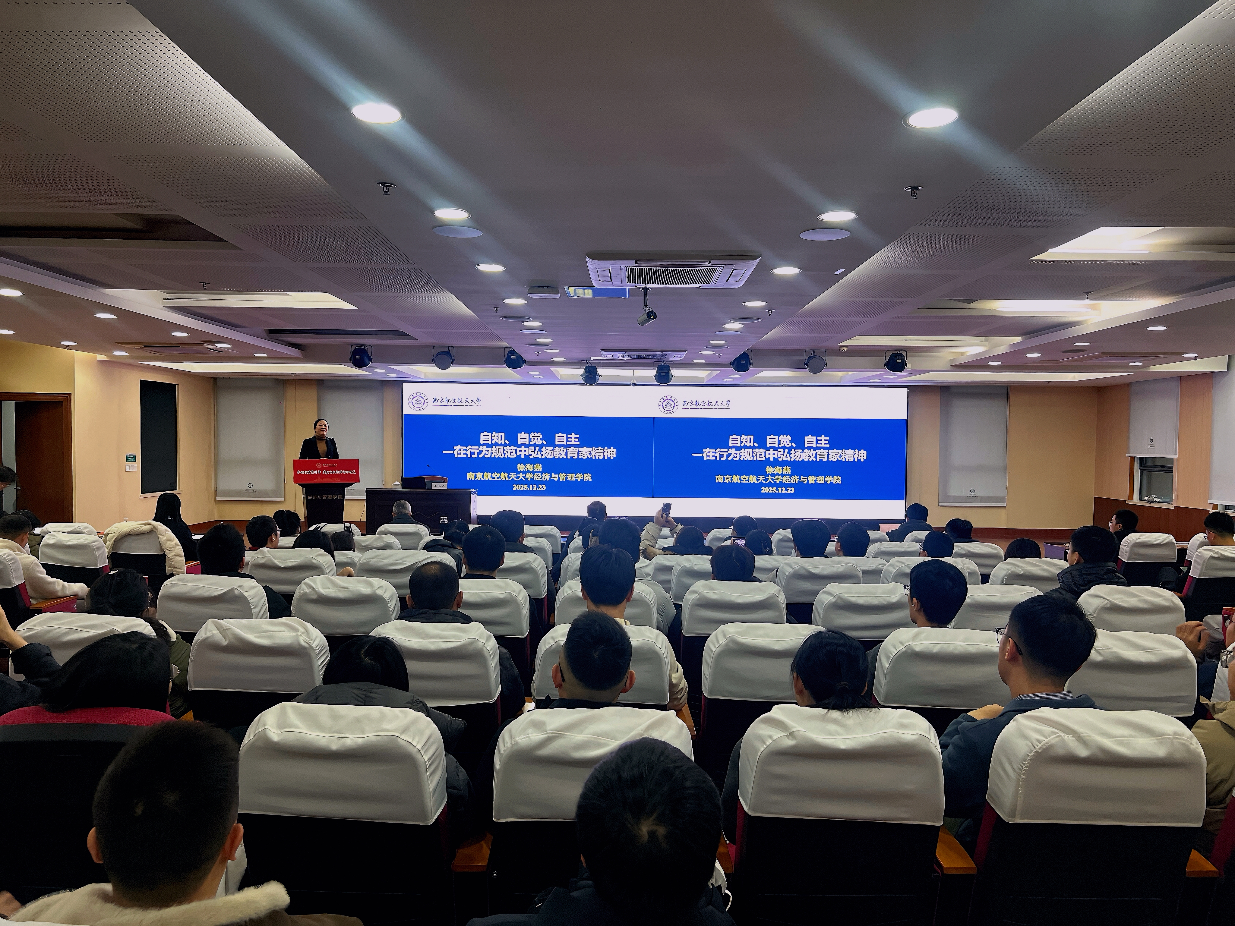 今年,学校根据教育部《新时代高校教师职业行为十项准则》等有关规定,结合社会主义核心价值观、教育家精神、“四有”好老师标准以及学校精神文化,制定并发布了《南京航空航天大学教师行为规范(试行)》。12月23日,“弘扬教育家精神,践行南航教师行为规范”系列宣讲活动在经济与管理学院举行。2025年江苏教师年度人物、国务院政府特殊津贴专家、经济与管理学院徐海燕教授,结合41年从教经历,从“自知、自觉、自主”的三重追求展开,分享育人感悟,讲述南航教师行为规范的精神内核。讲座由人力资源部/党委教师工作部副部长张晓燕主持,百余名教师参会。