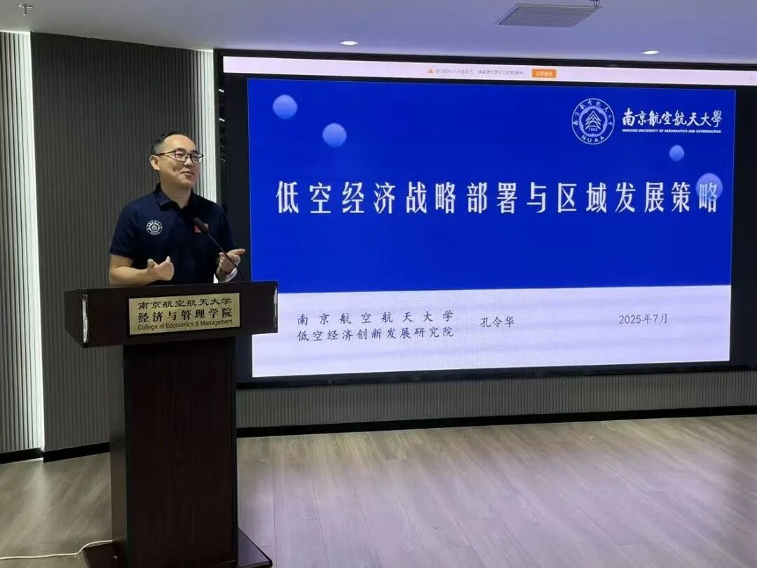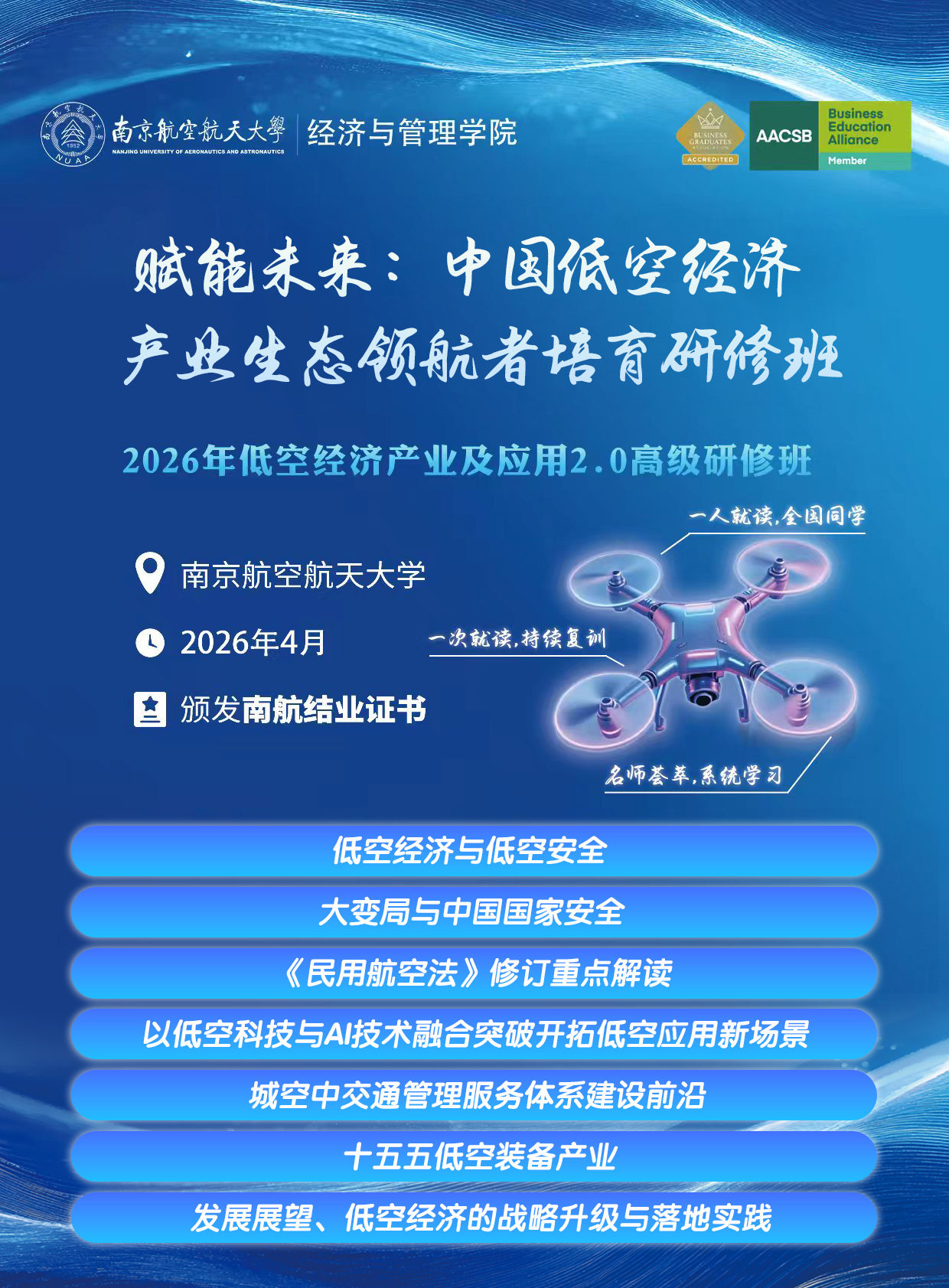 2025年12月,全国人大常委会会议表决通过新修订的《民用航空法》、国家发改委印发《低空经济及其核心产业统计分类(试行)》,南航经管学院中国低空经济产业生态领航者培育研修班应时推出,助力低空经济产业高质量发展。